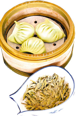 橙紅間白的蝦仁餡料,在綠油油、均勻透亮的餃子皮呵護(hù)下,像龍井茶一樣顯得更加?jì)赡?,而且口感爽滑、鮮甜,淡淡的龍井清香纏繞在口腔中。