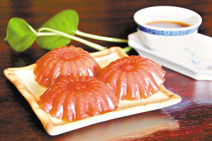 精致的紅茶盞是在原來傳統(tǒng)的馬蹄糕制作的基礎(chǔ)上,添加上玫瑰紅茶湯水制作而成的。玫瑰紅茶盞顏色如琥珀,入口爽滑不粘牙,濃郁的茶香給人一種飄飄然的感覺,舒心自在。