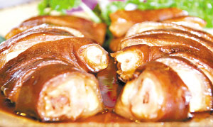 潤(rùn)口的普洱茶豬手,入口就能品嘗到普洱茶的陳香味。秀色的豬手就像普洱茶一樣經(jīng)歷了歲月的考驗(yàn),口感比較特別,肥而不膩、外表富有彈性而里面則嫩滑、清爽。