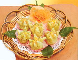 分為鐵觀音、綠茶、花茶三種口味,撒上蜜煉過的桂花,既美觀又香甜爽口,飯后吃上一盤,享盡口福。