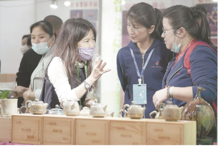 一位臺灣參展商(左)在介紹公司生產(chǎn)的特色茶具。 本報記者 王毅 攝