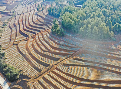 圖為日前,當(dāng)?shù)亟?jīng)過整治并種上茶樹幼苗的石漠化土地。