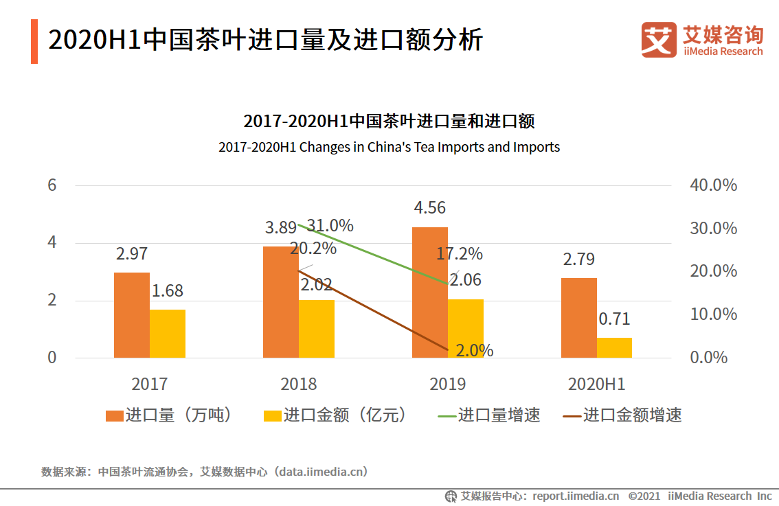 從進(jìn)口情況來(lái)看,2019年,中國(guó)茶葉進(jìn)口數(shù)量較上一年增長(zhǎng)17.2%至4.56萬(wàn)噸;茶葉進(jìn)口金額較一年增加2.0%至2.06億元。2020年上半年,中國(guó)茶葉進(jìn)口量和進(jìn)口金額分別為2.79萬(wàn)噸和0.71億元。