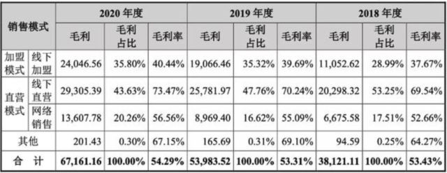 從銷售模式來看,八馬茶業(yè)采取的是“直營+加盟”、“線上+線下”的全渠道銷售體系。截至2020年末,公司門店數(shù)量超過2000家,其中直營店366家,加盟店超1700家。雖然,加盟店數(shù)量遠超直營店數(shù)量,但由于線下加盟模式的毛利率只有40%,遠低于線下直營模式73%的毛利率。因此,366家直營店貢獻的毛利與超過1700家加盟店貢獻的利潤大體相當。